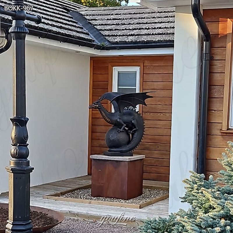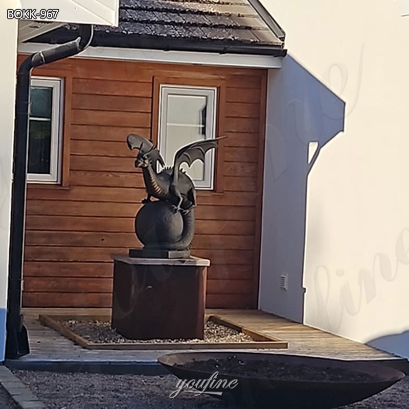 >>This striking bronze dragon garden statue depicts a majestic dragon perched on a textured sphere. With outstretched wings, a dynamic pose, and intricate detailing from horns to tail, this sculpture exudes power, grace, and mythical allure.