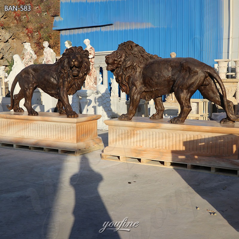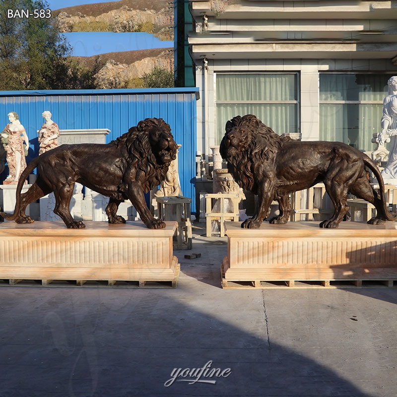 >>These outdoor large lion statues are meticulously crafted using the traditional lost-wax bronze casting process, showcasing powerful musculature, richly textured manes, and a majestic posture, symbolizing protection and nobility.
