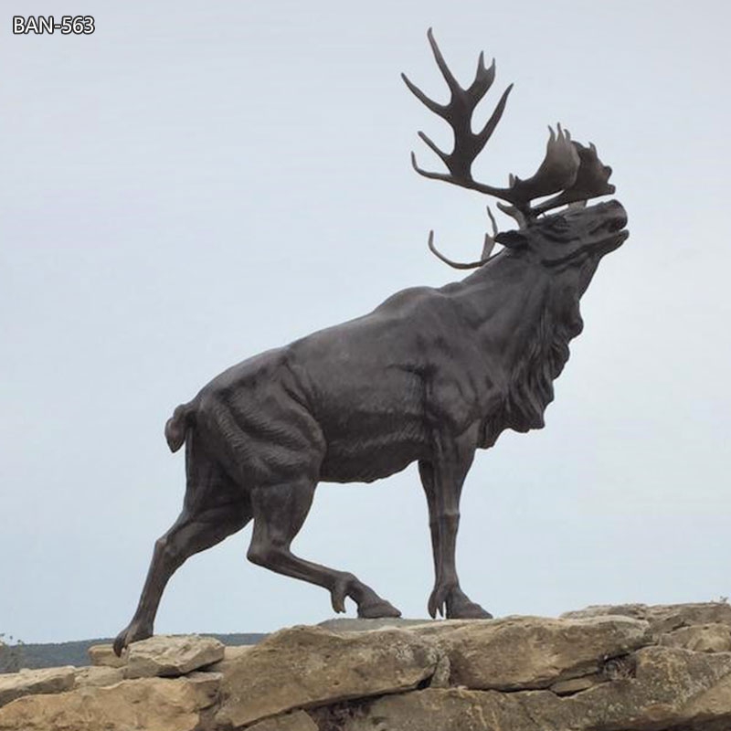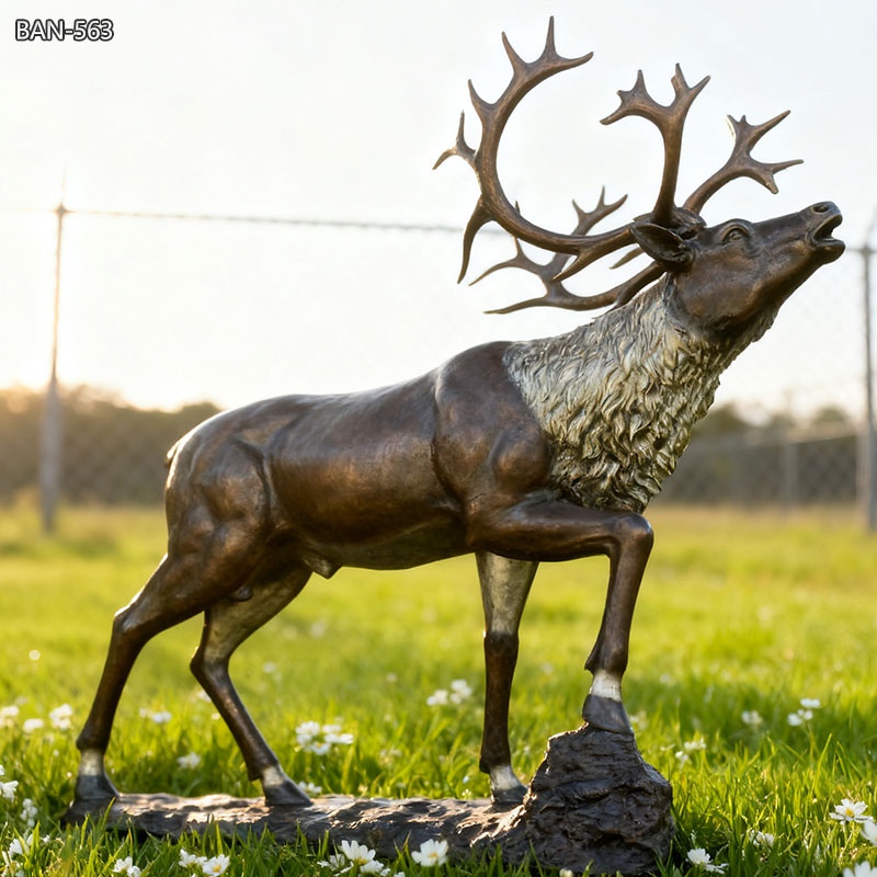 This life-sized bronze caribou statue stands on one leg on a rock base, antlers outstretched, as if in a resounding cry. It is ideal for a long-term outdoor installation on an estate, ranch, lodge, golf course, lakefront property, or hotel landscape.