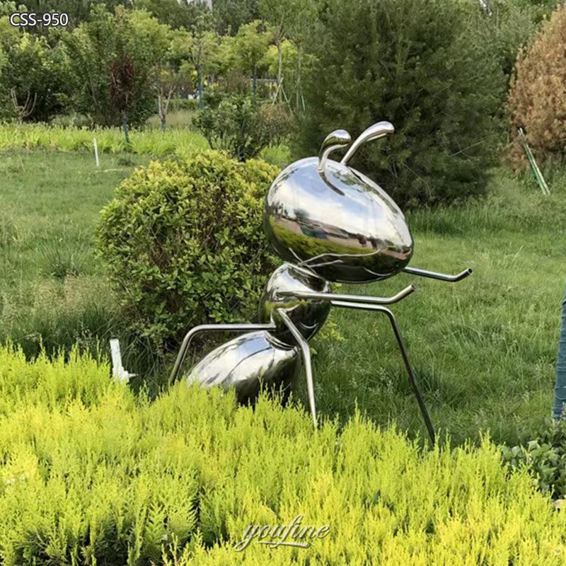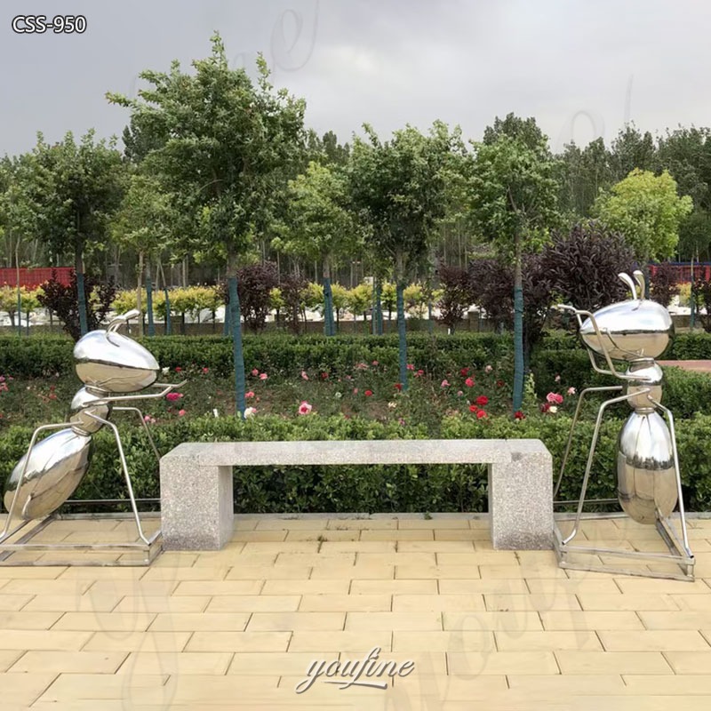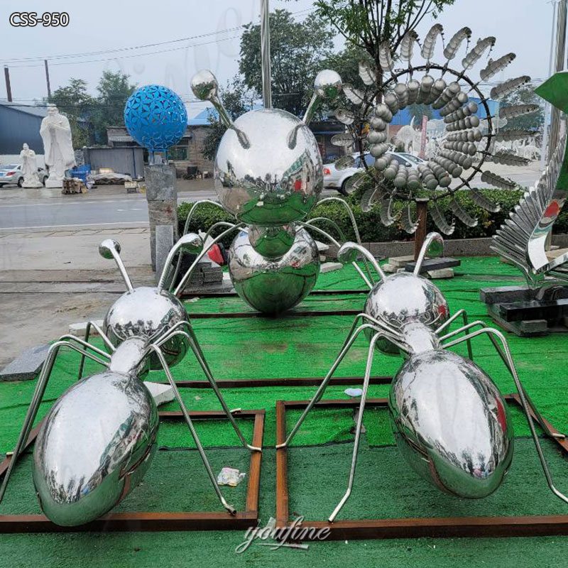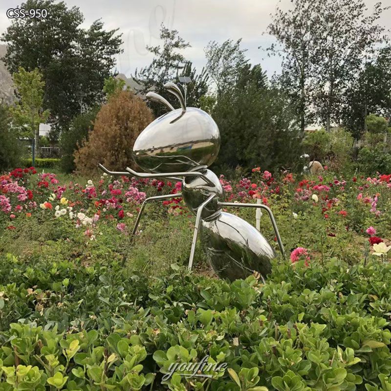 >>This large metal ant sculpture is made of high-quality stainless steel, with a highly polished surface that creates a mirror effect, perfectly reflecting the surrounding environment and creating a dynamic interaction between art, light, and landscape.