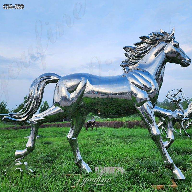 This stainless steel horse sculpture has a very eye-catching appearance. The whole sculpture is made of polished stainless steel, with a smooth and shiny surface that can reflect the surrounding environment, making the sculpture full of modernity.